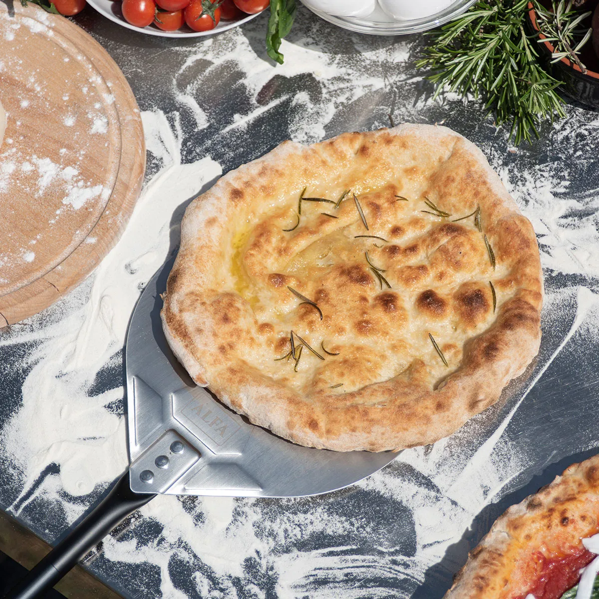 De Alfa Ronde Pizzaschep is het onmisbare hulpmiddel om de pizza tijdens het bakken te draaien, te verplaatsen en te controleren.
